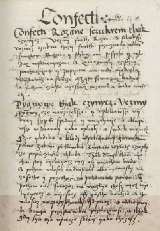 Ponadto w Conservatio sanitatis zapisano po polsku fragmenty zawierające proste porady medyczne, które dotyczą chociażby leczniczego zastosowania wódek, inne zaś zdradzają przepisy na konfekty z róży i pigwy. Sposób ich przygotowania (wstępne podsmażenie i dosuszenie w piecu, a następnie pokrojenie masy na kawałki) każe przypuszczać, że efektem końcowym był produkt, który współcześnie moglibyśmy nazwać batonem owocowym.