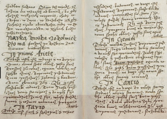 Wśród polskojęzycznych fragmentów rękopisu znajduje się także Nauka krotka, cokolwiek kto ma począć po<d> każdym znamieniem niebieskim – zwięzła instrukcja doradzająca i odradzająca wykonywanie określonych czynności wtedy, kiedy Słońce znajduje się w danym znaku zodiaku.
