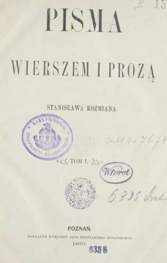 W latach 1870–1872 opublikował dwutomową edycję Pism wierszem i prozą. W tomie pierwszym pomieścił wiersze liryczne i patriotyczne, bajki i sonety. Znalazły się tam także przekłady poezji angielskiej, m.in.: Byrona, Burnsa, Coleridge’a, Cowpera, Moore’a, Scotta, Shelleya, Tennysona, Wordswortha. W tomie drugim natomiast znajdziemy studia o Niccoli Machiavellim, Konradzie Celtisie czy o generale Franciszku Morawskim, a poza tym rozprawy o istocie dziennikarstwa, o relacji Kraj – Emigracja, wreszcie o architekturze kościelnej. W późniejszych latach ogłosił Koźmian tom I z bliska, i z daleka. Poczet stu felietonów, zawierający jego krótkie formy dziennikarskie ukazujące się w „Kurierze Poznańskim” w latach 1878–1880, a nadto szkic Ślady historycznych wypadków polskich poświęcony motywom polskim w twórczości Szekspira.